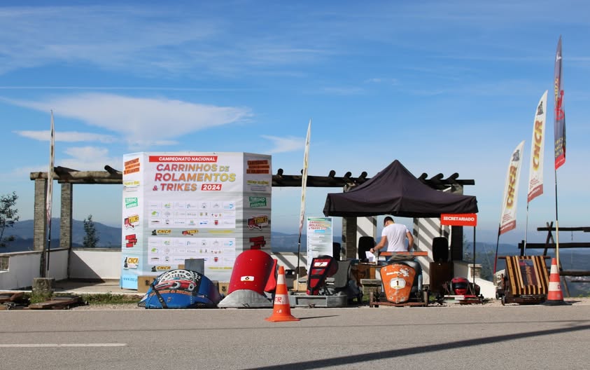 Estande ao ar livre numa estrada com tenda preta, equipamentos e banners coloridos