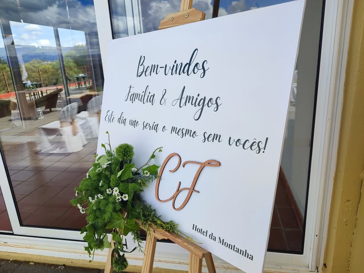 Placa de boas-vindas com texto e decoração floral apoiada em cavalete de madeira