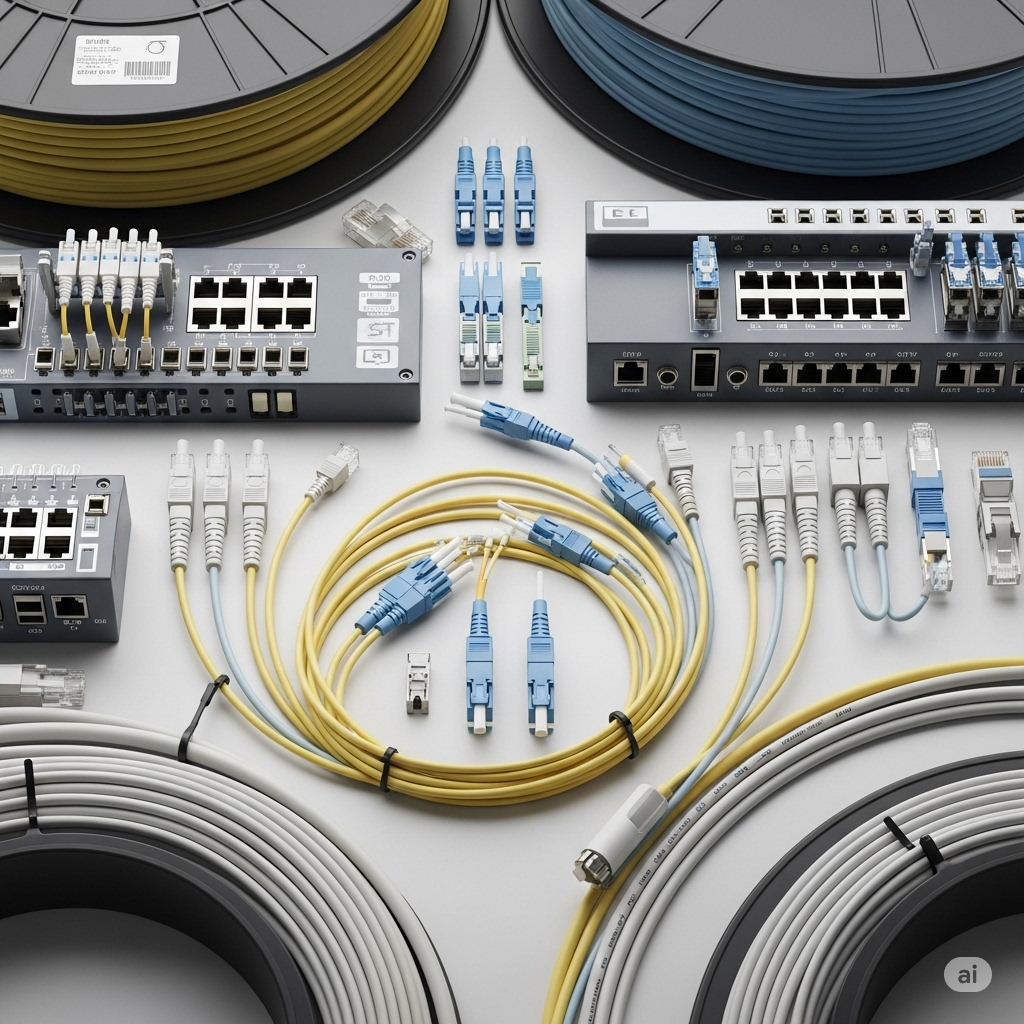 Cabos e equipamentos de rede com etiquetas em fundo branco