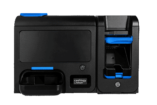 Dispositivo de pagamento eletrónico preto com detalhes azuis e etiqueta 'cashlogy by Adyen'