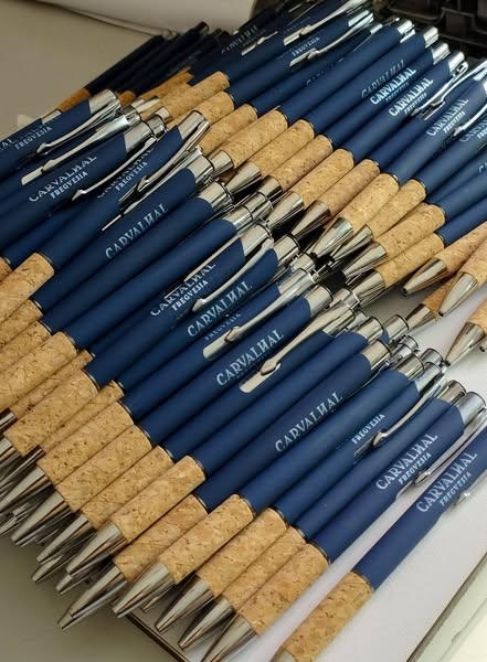 Muitas canetas azuis com pega de cortiça e texto branco CARVALHAL REGIÃO