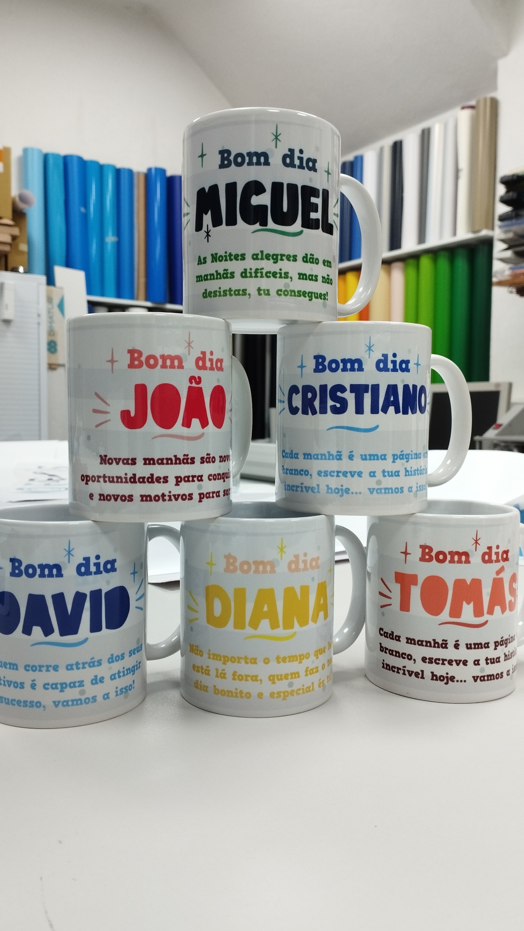 Canecas brancas com nomes e mensagens em várias cores empilhadas num espaço com materiais de escritório.