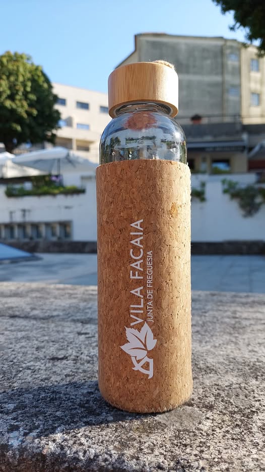 Garrafa de vidro com capa em cortiça e tampa de madeira com texto Vila Facaia