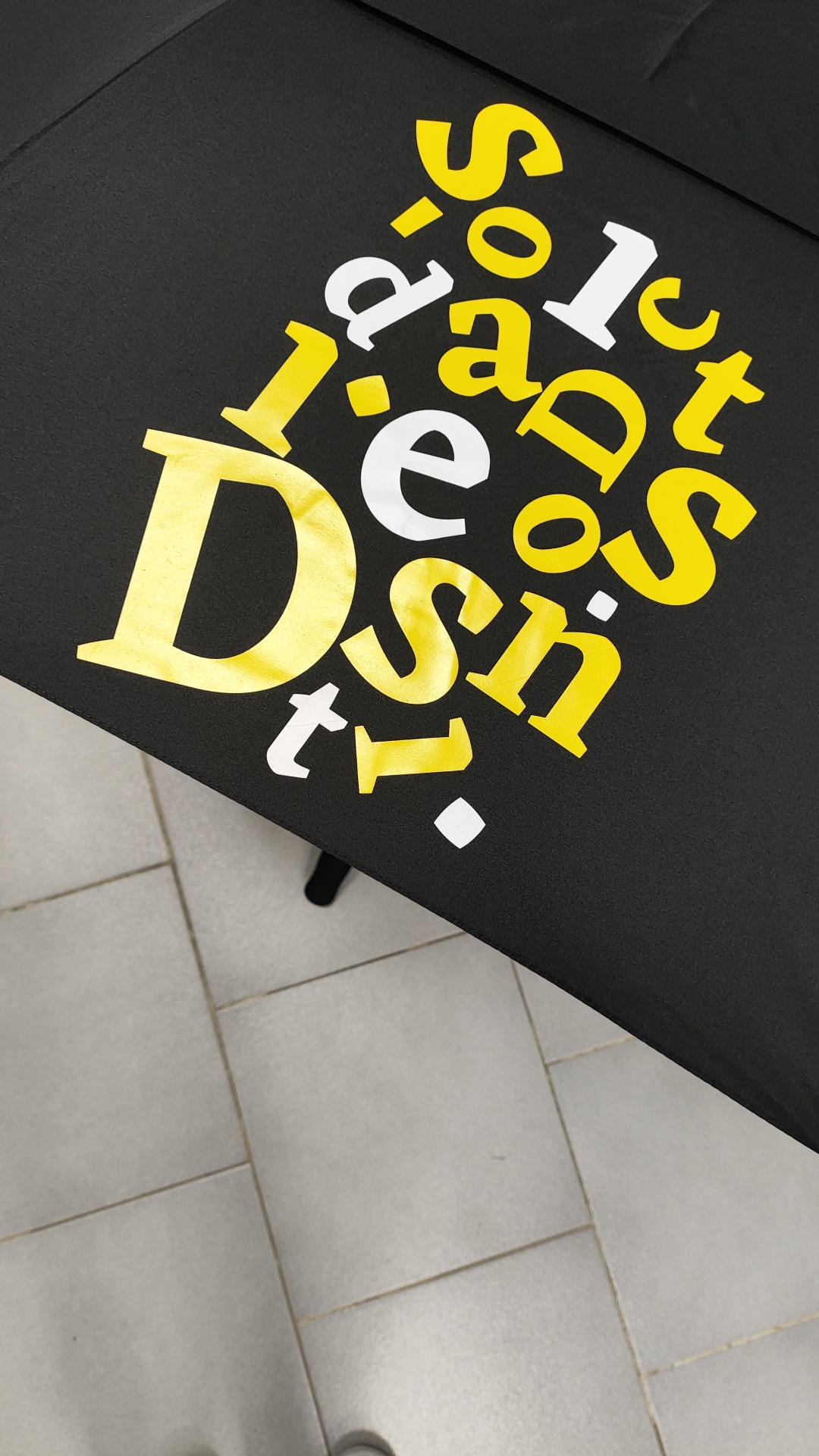 Guarda-chuva preto com letras amarelas e brancas formando 'Soft Design'