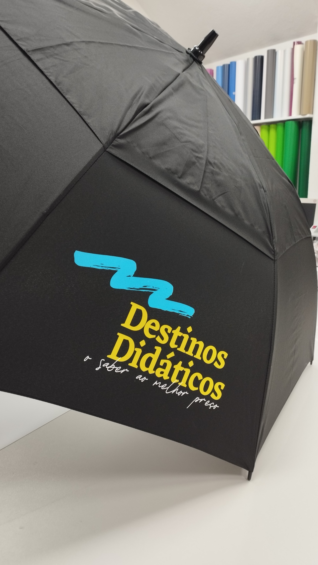 Guarda-chuva preto com texto colorido e rolos coloridos ao fundo