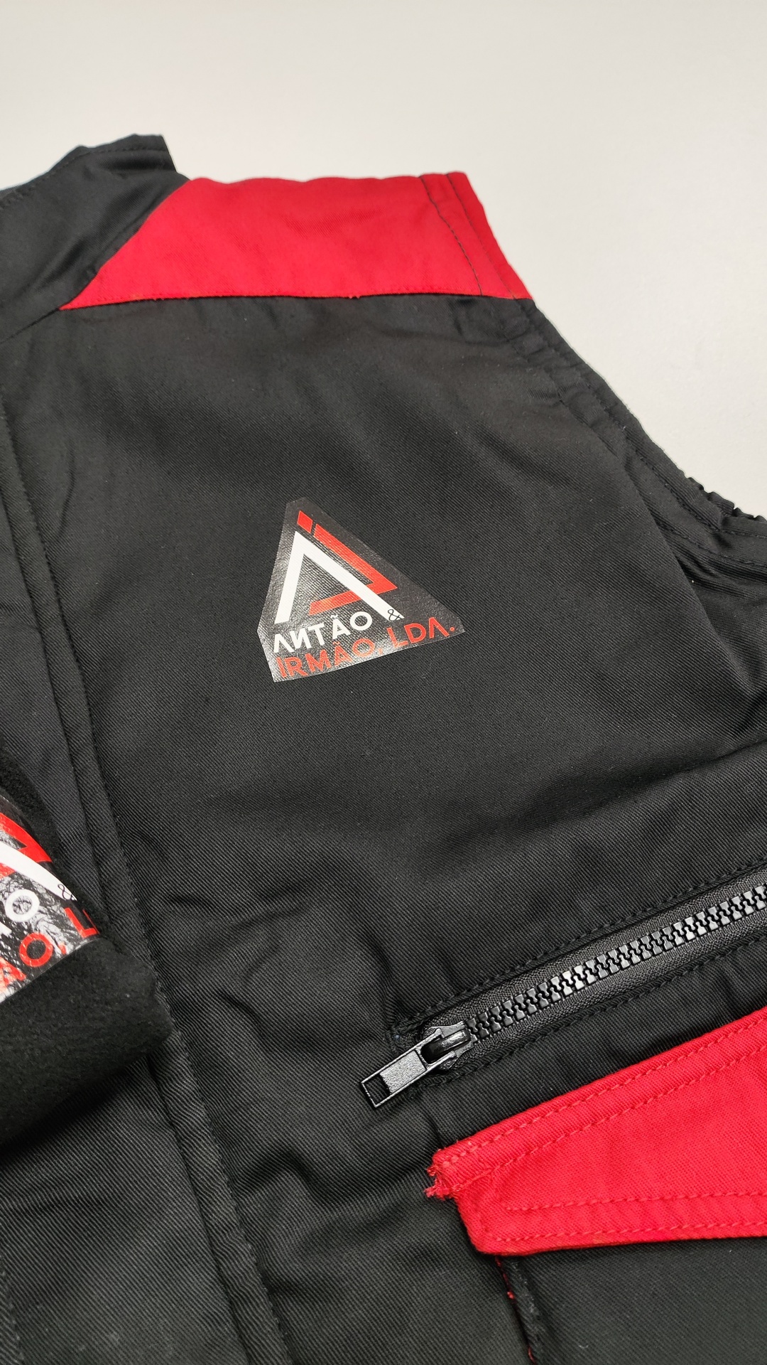 Casaco preto com detalhes vermelhos, fecho de correr e logótipo triangular