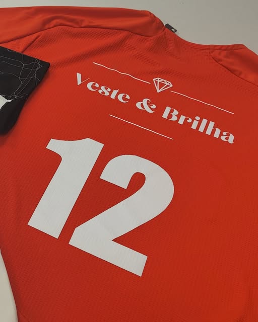 Camisola desportiva vermelha alaranjada com número 12 branco e texto Veste & Brilha