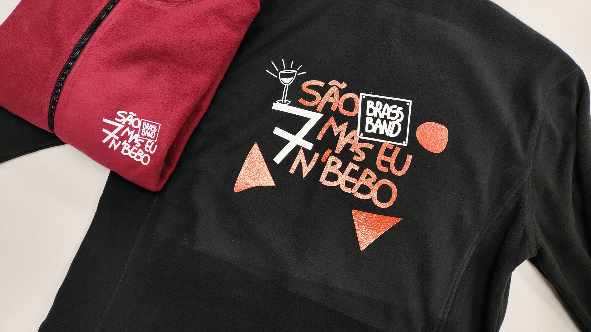 Casaco preto e vermelho com texto branco e laranja