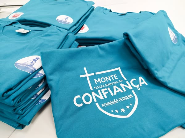 T-shirts azuis com estampado branco 'MONTE NOSSA SENHORA DA CONFIANÇA'