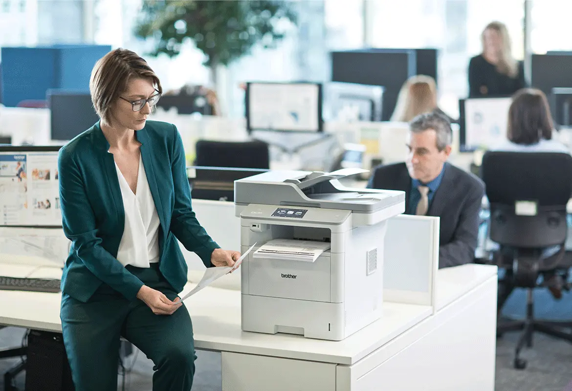 Mulher junto de impressora Brother num escritório moderno