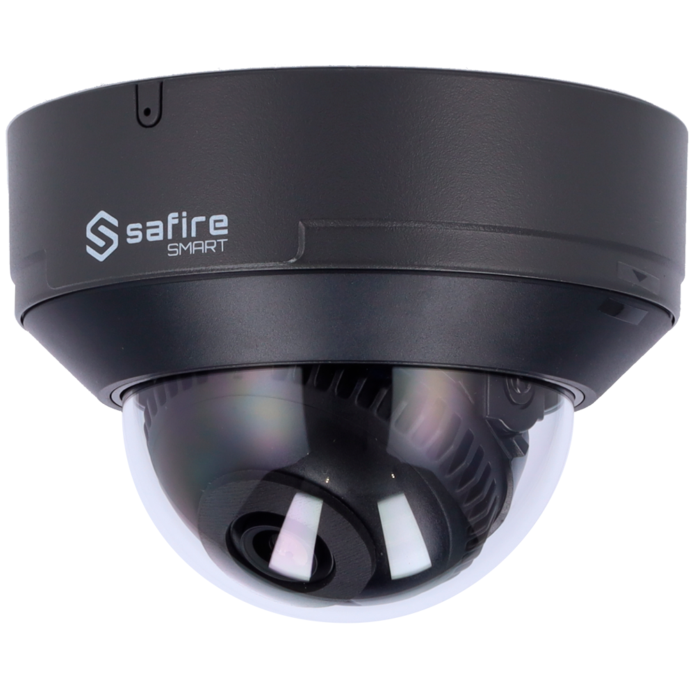 Câmara de segurança dome preta com cúpula transparente e logo 'safire SMART'