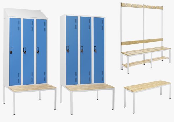 Conjunto de cacifos com portas azuis e bancos de madeira clara e estrutura metálica branca