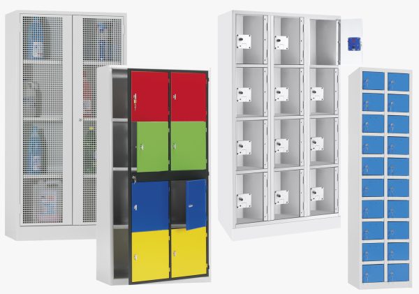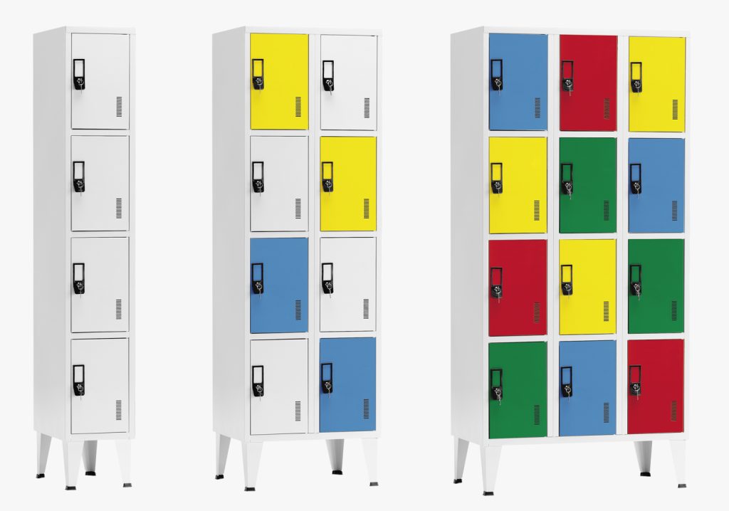 Armários metálicos coloridos com portas em vários tons e fechaduras