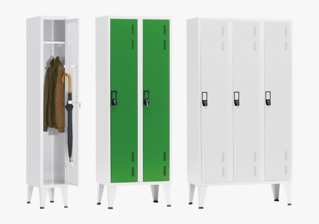 Armários metálicos com portas brancas e verdes, um aberto mostrando casaco e guarda-chuva.