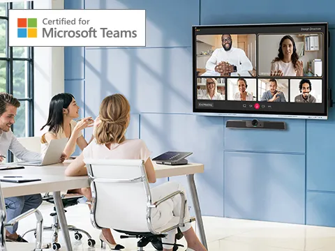 Sala de reunião com videoconferência numa televisão e logótipo 'Certified for Microsoft Teams'