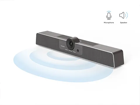 Barra de som preta com câmara central e ícones de microfone e altifalante