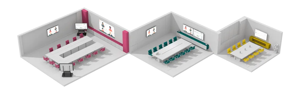 Três salas de reuniões com mesas e cadeiras coloridas em ambiente moderno.
